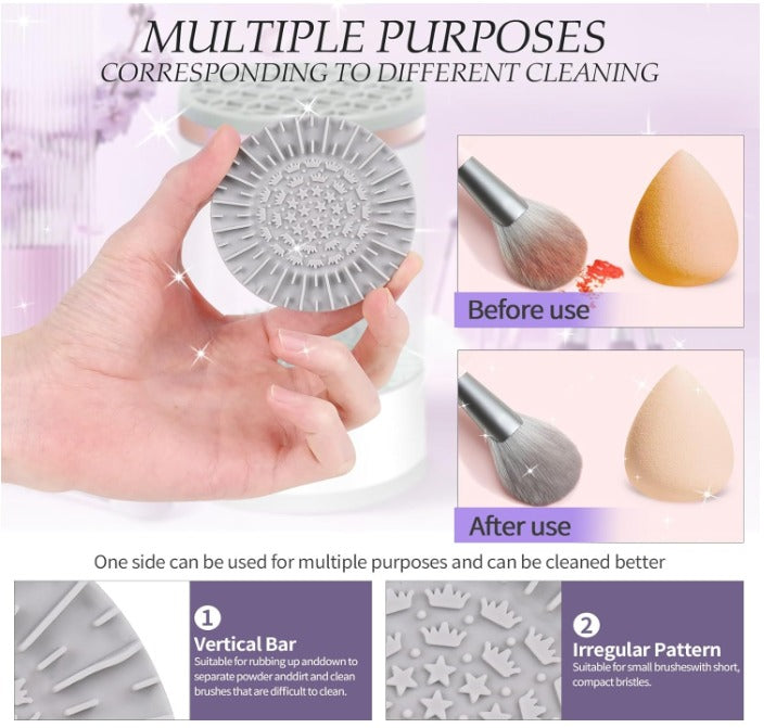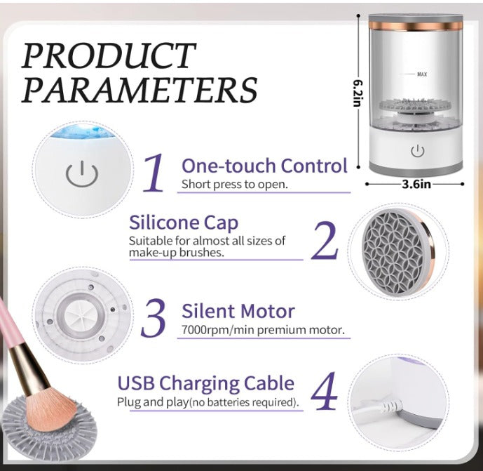 Tiene 2 modos de limpieza, automático y de mano. Simplemente agregue agua y jabón líquido, el agua no debe sobrepasar la línea máxima. Se pueden colocar hasta 4 brochas para una limpieza. Después de una limpieza profunda, gire la cubierta de silicona boca abajo para secar.
